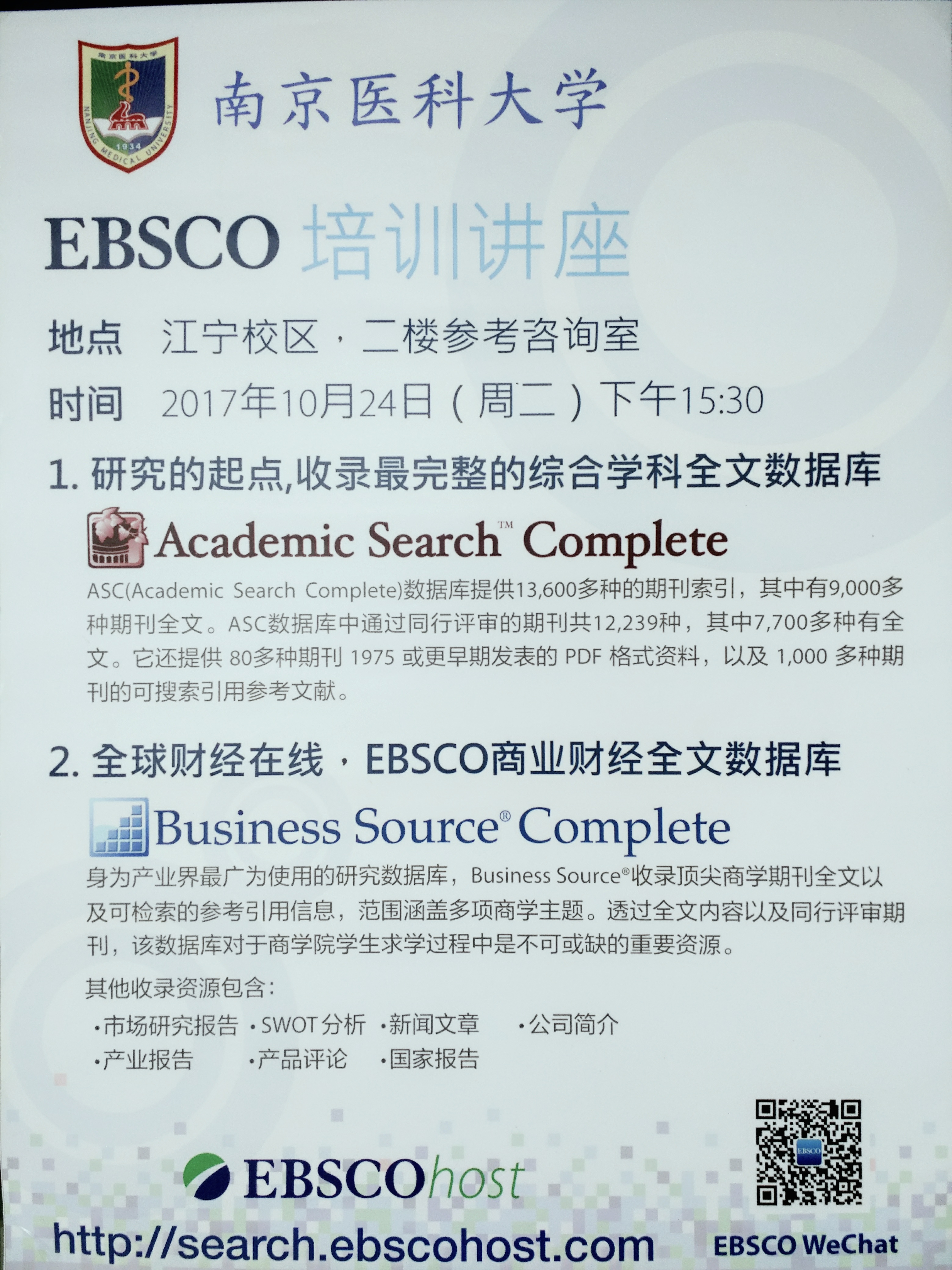讲座题目:EBSCO培训讲座 讲座时间:2017年10月24日(星期二)下午15:30 讲座地点:江宁校区图书馆二楼参考咨询室