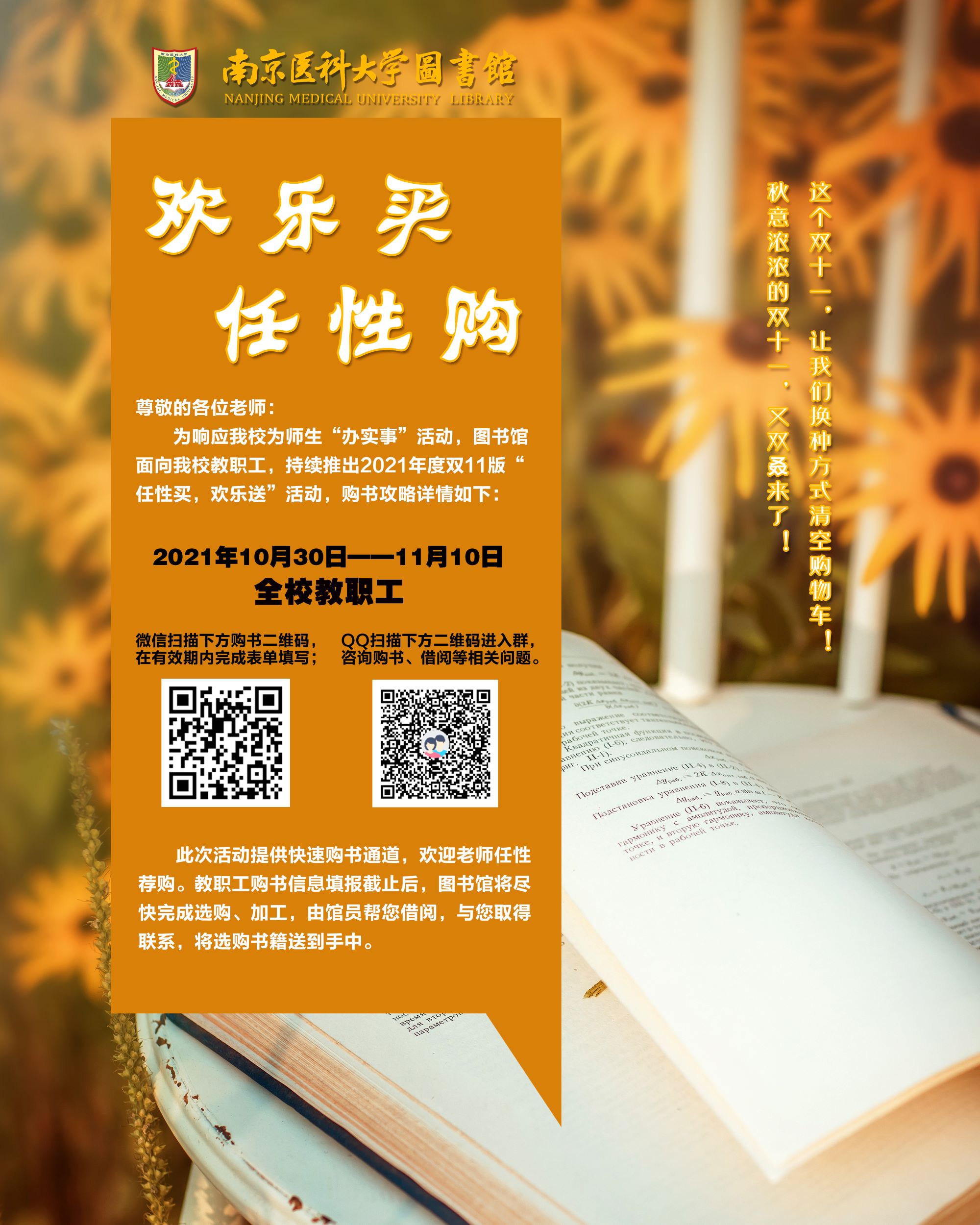 为响应我校为师生“办实事”活动,助力我校教职工参与馆藏文献资源建设,持续向读者们提供更贴近需求的馆藏,图书馆将开展2021年度秋季图书“任性买,欢乐送”活动。详情如下:  ...