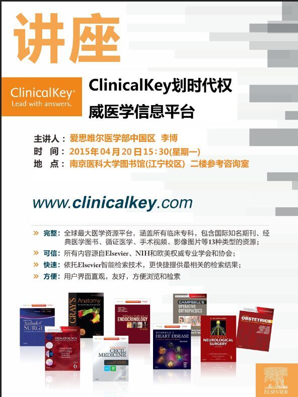 讲座时间:2015年4月20日 15:30 讲座地点:江宁校区图书馆二楼参考咨询室 主讲人:李博 内容简介:ClinicalKey是来自爱思唯尔的权威医学信息平台,包括期刊、 图书、 循证医学 、手术录像等。 讲座主要...